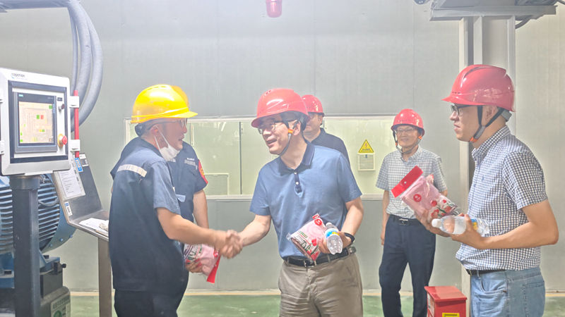 韓新偉一行深入明日新材料、新光公司等多個生產車間及倉庫,實地查看了員工的工作環境,詳細了解防暑降溫措施落實情況,為一線員工送上礦泉水、毛巾等防暑物資,并與員工親切交談,叮囑他們合理安排作息,確保安全生產。